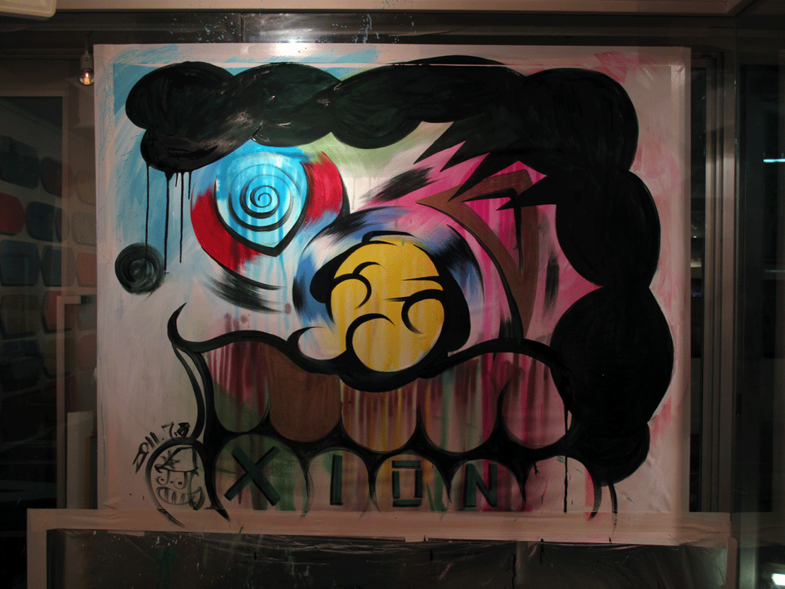 キャンバスを直線的に分断するコマ割のような画面、シンプルにデフォルメされた抽象的なモチーフ、アクソメトリックで描かれた立体構造が浮かび上がってくるようにも見える全体像などからは、これまでも彼のコアであった漫画やグラフィティアートの影響を思わせる。